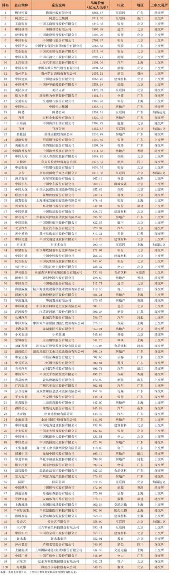 “第5届中国(上市)企业品牌价值百强榜”,榜单覆盖了26个行业,总价值为104118.42亿元,品牌的平均价值为1041.18亿元。其中,腾讯以6864.67 亿元、阿里巴巴以6311.20 亿元、中国工商银行以4349.45 亿元分列中国(上市)企业品牌价值百强榜前三甲。本年度,中国(上市)企业品牌价值超过6000亿的有2个,品牌价值在3000亿至5000亿之间的有3个;品牌价值在2000亿至3000亿之间的有7个。在一定程度上反映并预示中国头部上市品牌的发展现状与趋势,展示了中国品牌随着经济发展和资本市场建设取得的丰硕成果。上市企业品牌价值百强榜科学反映出各行业、各区域的品牌价值现状、发展趋势和品牌影响力,为政府机构、市场投资者、品牌运营者提供相对客观的决策依据。